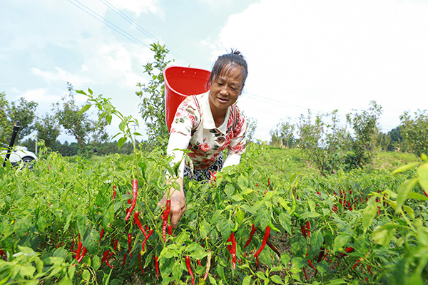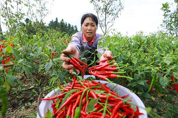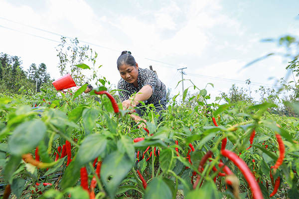 村民正在採摘小米椒。(劉夢 攝)