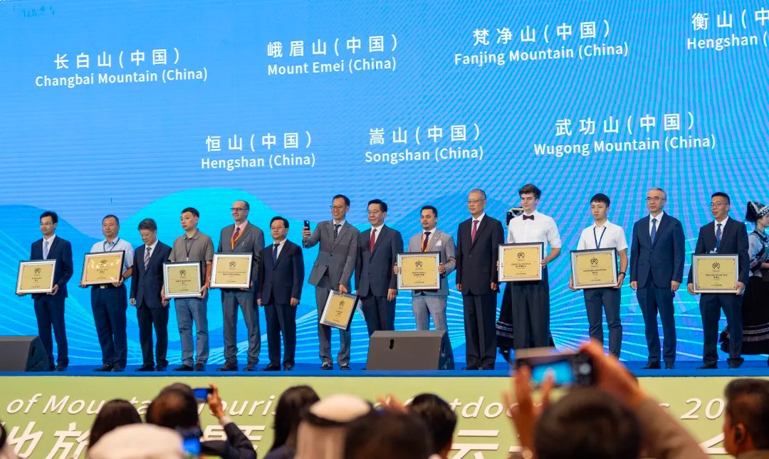 大會開幕式現場,國際山地旅游聯盟發布並授牌了瑞士少女峰、尼泊爾安納普爾納峰、西班牙裏斯科卡伊多考古和聖山、葡萄牙埃什特雷拉山脈、南非共和國桌山、中國吉林長白山、四川峨眉山、貴州梵凈山、湖南衡山、雲南玉龍雪山、山西恒山、河南嵩山、江西武功山、湖南莽山為首批14座“世界旅游名山”。