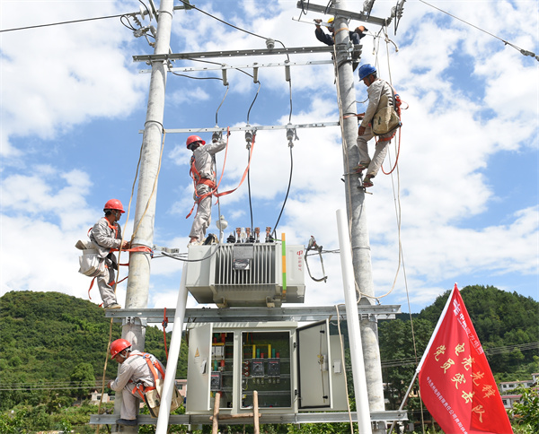 南方電網貴州電網公司工作人員在更換配變。(陳舉 攝)