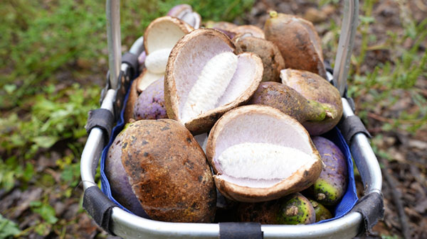 成熟的八月瓜自然裂開,露出乳白透亮的果肉。(陳昆 攝)