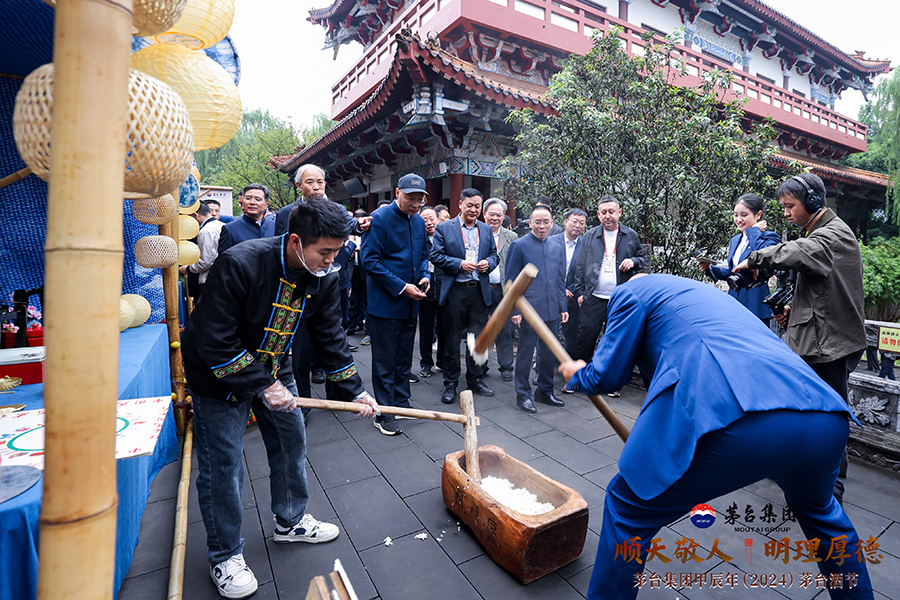 10月11日,參加茅&酒節的嘉賓體驗當地民俗打糍粑。