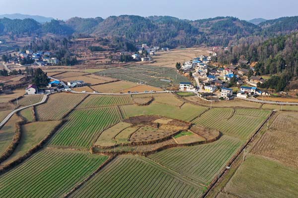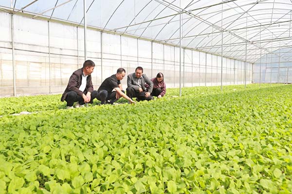 岑鞏縣天馬鎮杜麻村村支兩委在油菜育苗基地查看油菜幼苗長勢。(唐鵬 攝)