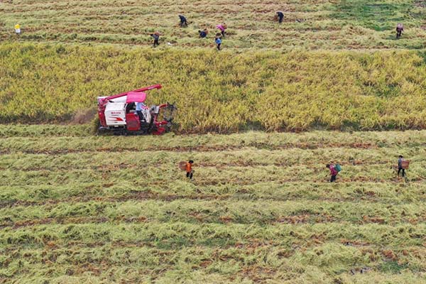 收割機在杜麻村收割優質稻。(唐鵬 攝)