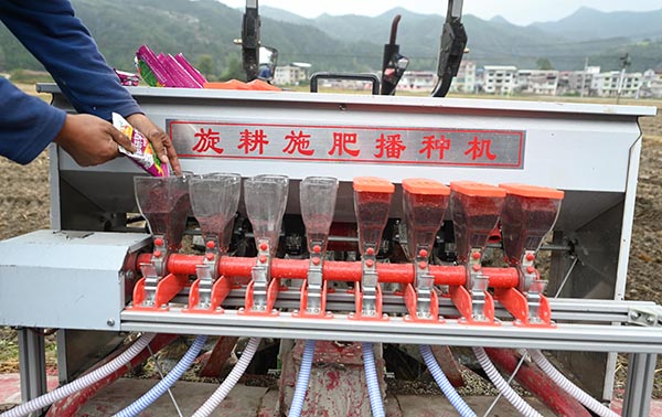 10月16日,村民在松桃苗族自治縣烏羅鎮裝油菜種子到設備中。(謝慧芳 攝)