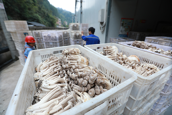 劍河縣食用菌産業園內的貴州順誠生物科技有限公司內分揀打包的食用菌。(吳昌連 攝)