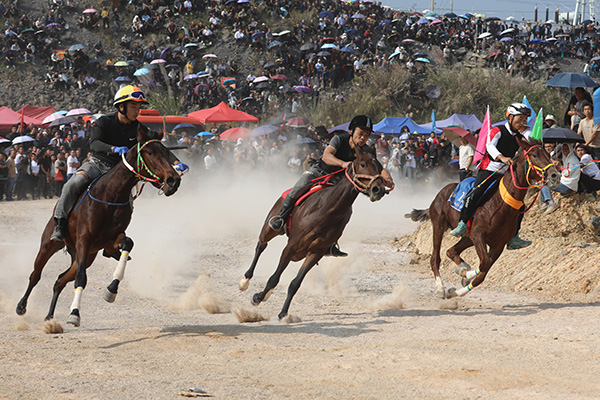 參賽的駿馬膘肥體壯、雄姿勃勃,英姿颯爽的騎手們在各個彎道展現了過人的技術,駿馬疾馳,驚險刺激,令人目不暇接,游客競相拍照記錄精彩瞬間。(張俊峰 歐聖兵)