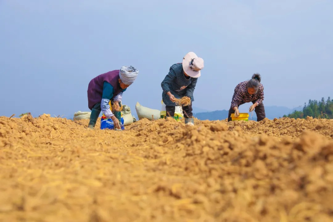 在山頭另一邊的當領村,30幾名工人分工協作,梳溝起壟、種植太子參,歡聲笑語回蕩在山間。