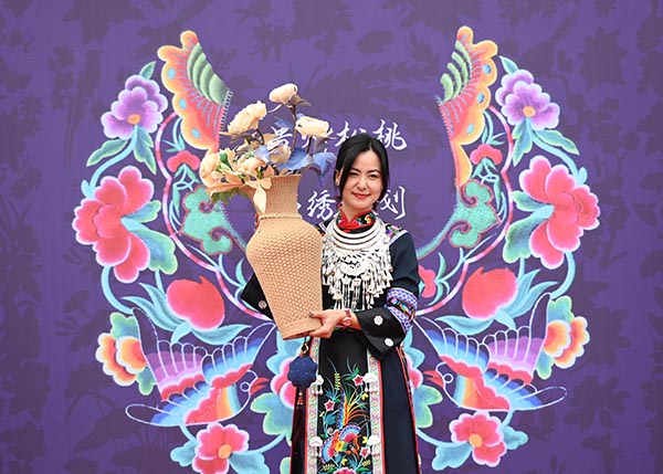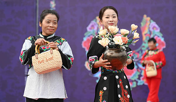 11月14日,在松桃苗族自治縣蓼皋街道團山社區,人們以走秀形式展示手工編織的産品。(謝慧芳 攝)
