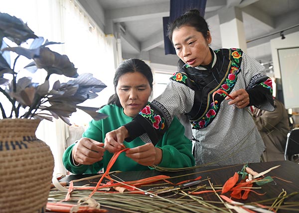 11月14日,在松桃苗族自治縣蓼皋街道團山社區,傳統手藝人黃松琴(右一)在教人們編織手工産品。(謝慧芳 攝)