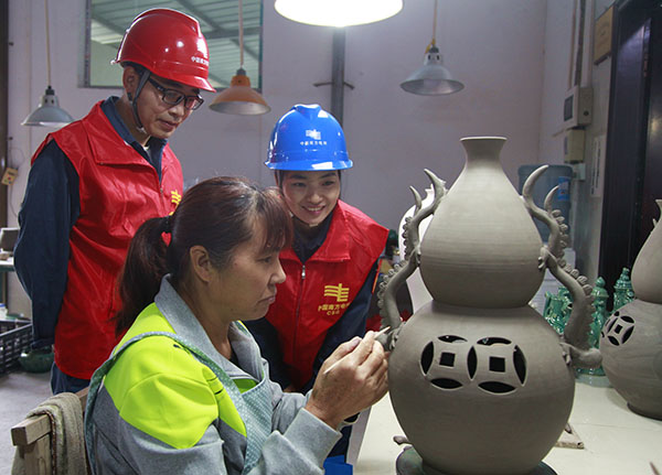 工作人員現場了解“牙舟陶”製作工藝。(陳竟 攝)