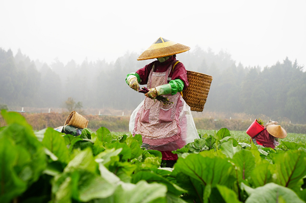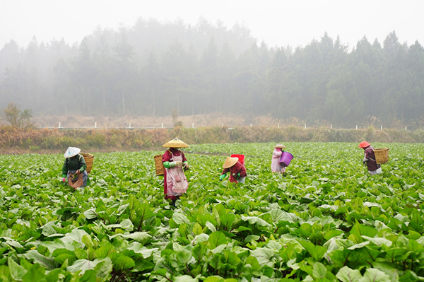 初冬時節,細雨濛濛。走進貴州省岑鞏縣天馬鎮白岩坪村秋冬蔬菜種植基地,薄霧瀰漫的菜地裏,能清晰看出青翠挺立的白菜薹、紅菜薹植株長勢旺盛。村民們正背着背簍忙碌穿梭在菜地的行壟間,動作熟練地採摘新鮮菜薹、捆紮裝框,田間地頭是一派熱鬧喜人的豐收景象。