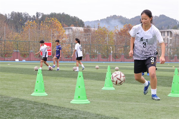 “膝蓋抬高,步子邁大。”“手臂擺動起來,跟上節奏!”和隊員們一樣全神貫注地投入在訓練中的還有亞足聯B級教練、新疆職業女足退役運動員、現任貴州省女子U16全運會代表隊主教練馮婭。她將先進的訓練理念、戰術體系傾囊相授,從基礎控球技巧的趣味教學,到複雜團隊配合的沙盤推演,在訓練場上手把手糾正動作、一對一打磨意識,以專業匠心雕琢璞玉之才。