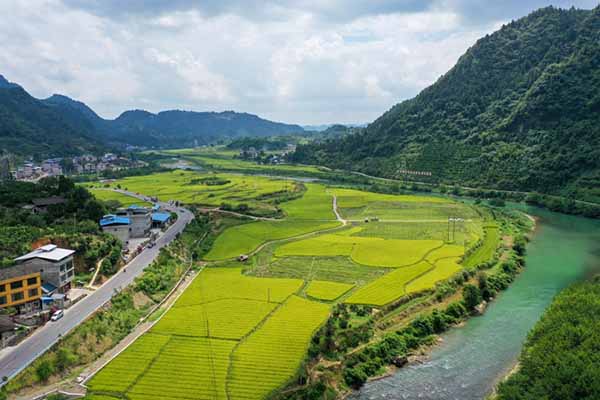 岑鞏縣屬亞熱帶溫暖溫潤氣候,雨熱同季、光熱同步。每到秋收時節,金黃色的稻穗鋪滿稻田,水稻脫粒、秸稈粉碎、種子裝袋、貨車轉運,村民們一氣呵成。