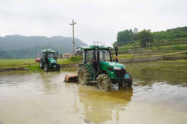 岑鞏縣注溪鎮周坪村雜交水稻制種基地,大型旋耕機下田作業。(吳念 攝)