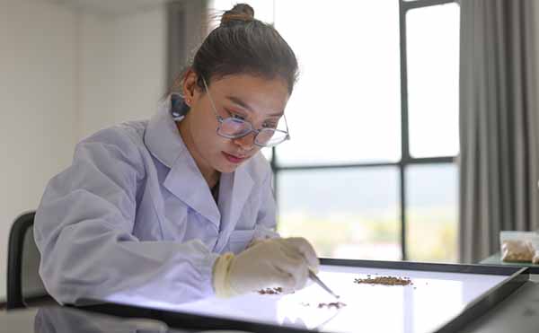 岑鞏縣注溪鎮周坪村,侯佳媛對水稻種子進行凈度分析。(胡攀學 攝)