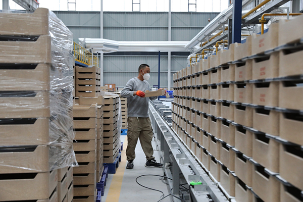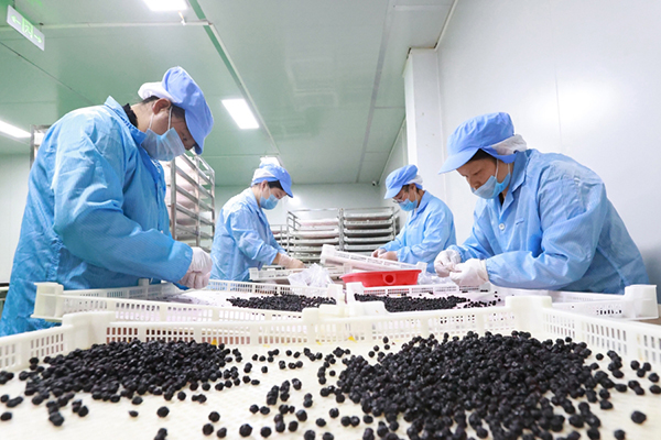 貴州美洋洋食品有限公司員工正在包裝黃桃幹。(唐鵬 攝)