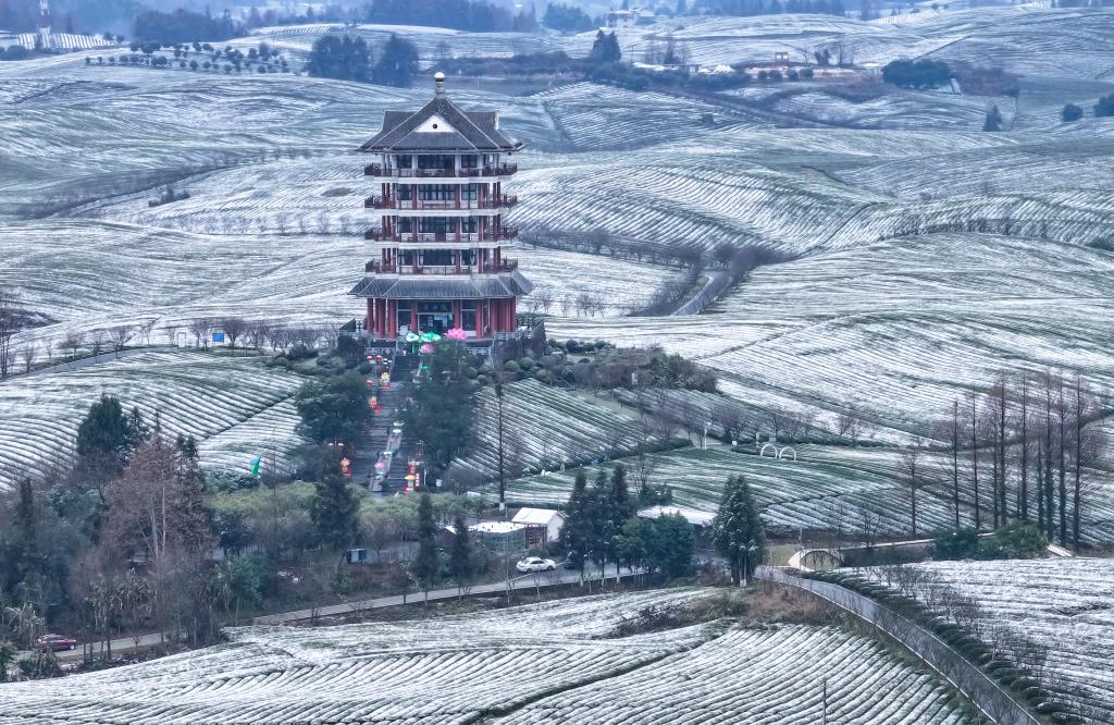 1月9日,位於貴州省遵義市湄潭縣的萬畝茶海迎來降雪,茶園被白雪覆蓋,別有韻味。