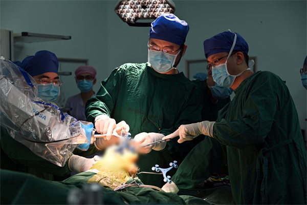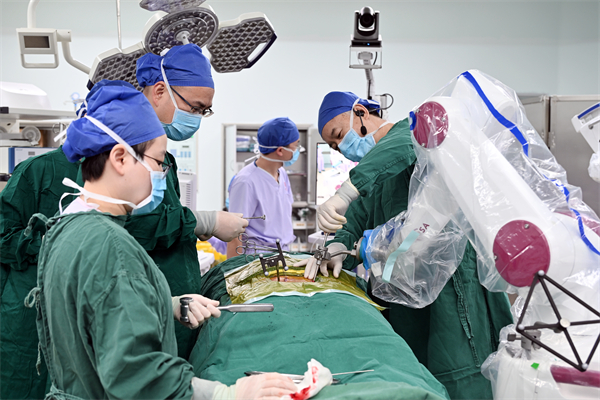 65歲的陳女士腰部疼痛持續了10年,1年前加重並伴右下肢疼痛麻木,入院後診斷為腰椎滑脫症和腰椎間盤突出症。專家在機器人輔助下為陳女士施行椎間盤摘除、神經黏連松解術、腰4腰5椎弓根內固定術等,為患者解決了腰痛及下肢疼痛麻木的問題。腰痛及下肢疼痛麻木症狀完全緩解,術後第三天自主下床行走。