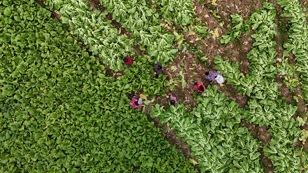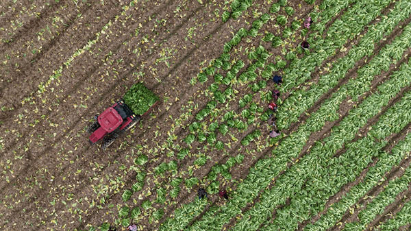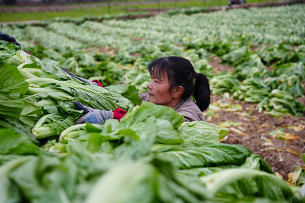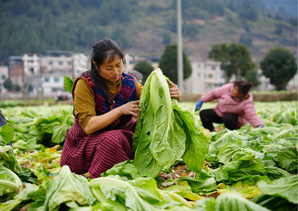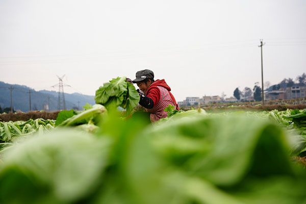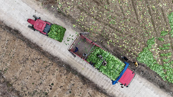 岑鞏縣水尾鎮大樹林壩區芥菜種植基地,村民在采收芥菜裝車。(楊樹 攝)