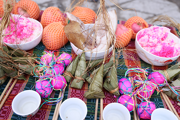 當天,雙龍湖村寨門口熱鬧非凡,孩子們身着新衣,背着紅雞蛋和粽子,在人群中穿梭嬉戲。水族群眾身着五彩斑斕的節日盛裝,設置攔門酒,向過往親朋好友、客人發放紅雞蛋,用美妙動聽的水歌祝福遠道而來的客人。