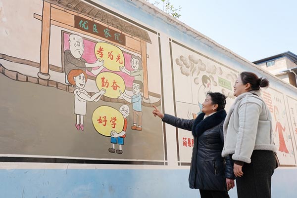 居民劉金蓮(左)在介紹社區新繪製的文明墻畫。(陳昆 攝)
