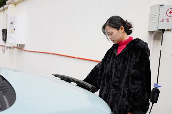 肖雅文在小區智能充電樁上充電。(周燕 攝)