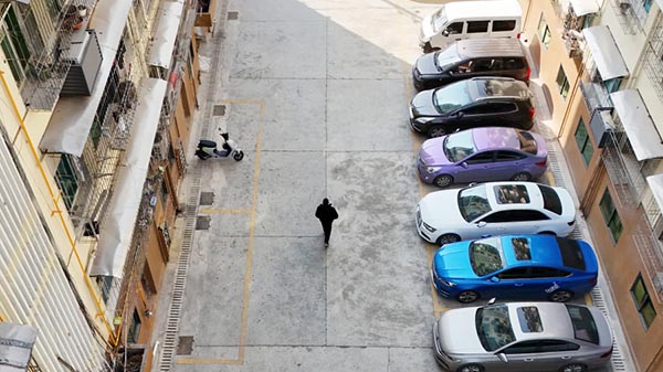 萬福社區友誼小區,車輛整齊停放在統一規劃的停車位內。(陳昆 攝)