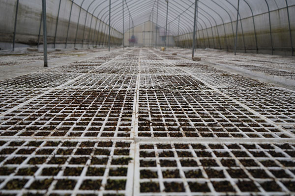 烤煙育苗基地大棚內整齊擺放的育苗漂盤。(朱勝攀 攝)