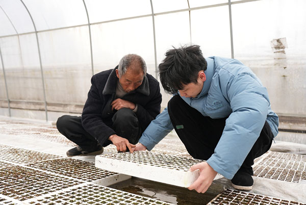 入春以來,26歲的客樓收購組煙葉生産技術員楊寧俊,每天一到基地的第一任務,就是鑽進大棚觀察漂盤內煙苗生長情況,並對工作人員進行現場指導。