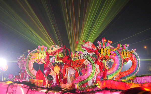 夜幕降臨,甕水長歌廣場上鑼鼓震天,45支龍獅隊氣勢磅礡登場,祈福儀式和彩塘儀式相繼開展。人們在龍獅見證下許願,祈盼美好未來。