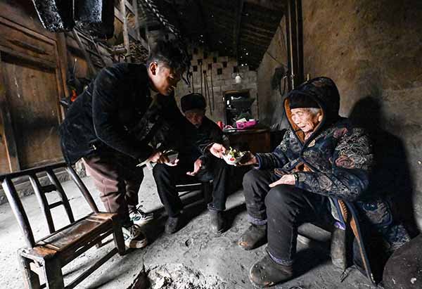 當天,舒易飛給爺爺奶奶做了一道白菜豆腐湯。他把豆腐煎至兩面金黃,再加水、煮菜。有人給他家送來了社飯,他熱好飯,把菜夾在碗裏後端給爺爺奶奶,祖孫三人圍着火堆一起吃飯。