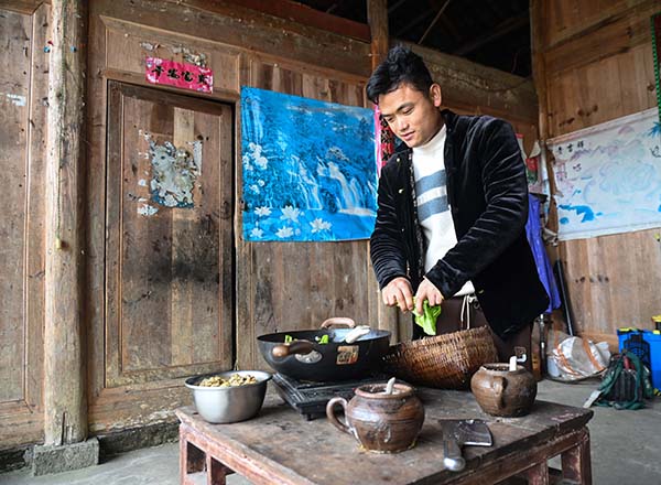 舒易飛,松桃苗族自治縣平頭鎮蓮塘村村民,他照顧年邁的爺爺奶奶,被左鄰右舍稱為有孝心的孩子。3月18日,筆者看見了在家裏忙碌的舒易飛。
