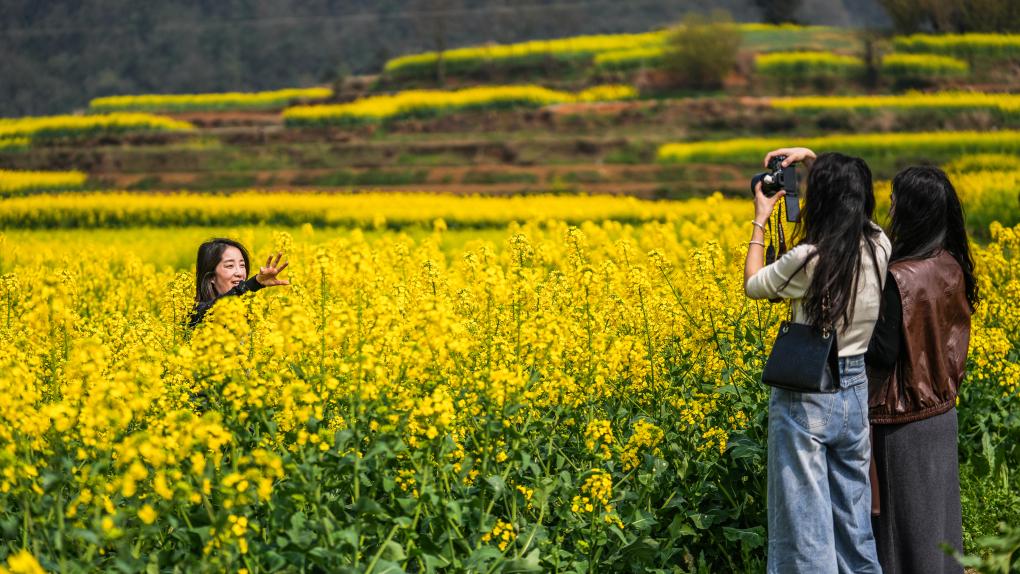 3月22日,游客在貴州省六盤水市六枝特區木崗鎮瓦窯村的油菜花田裏拍照游玩。