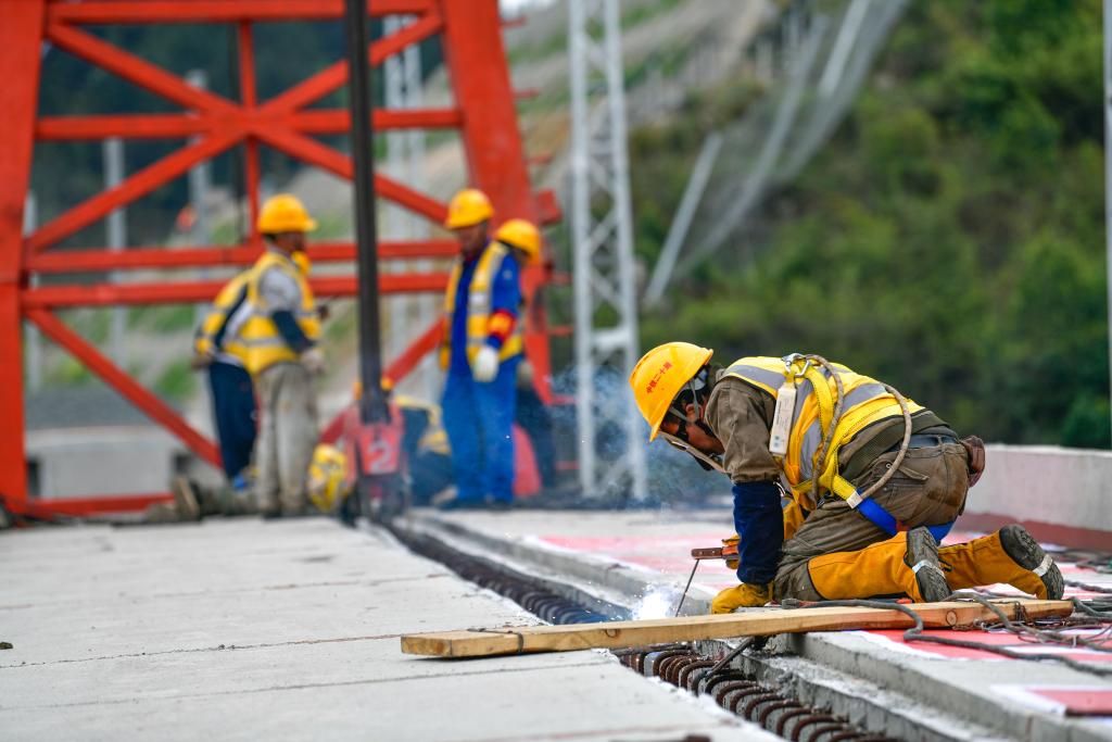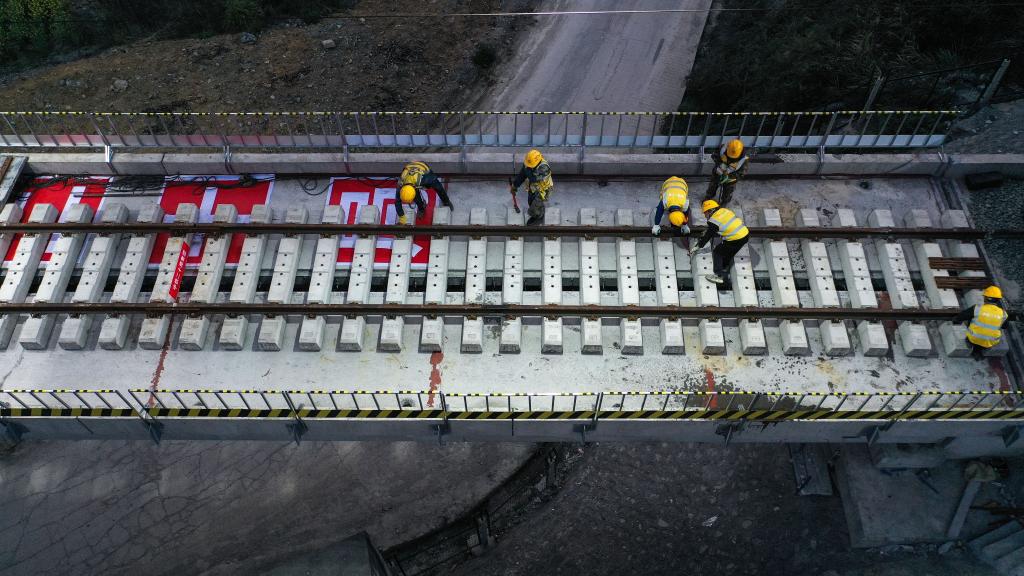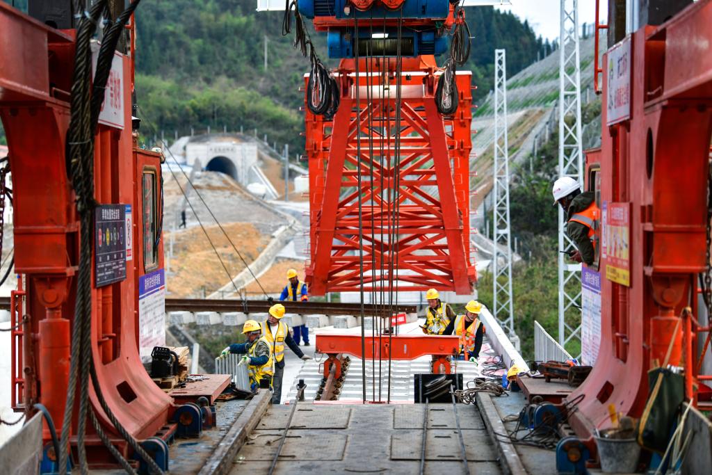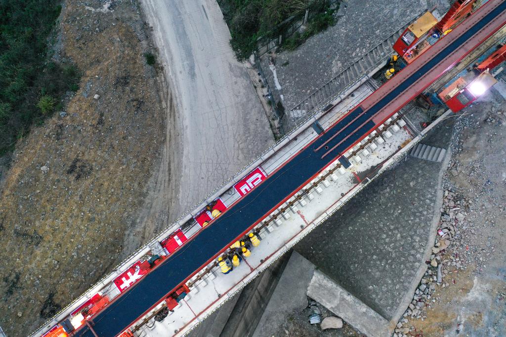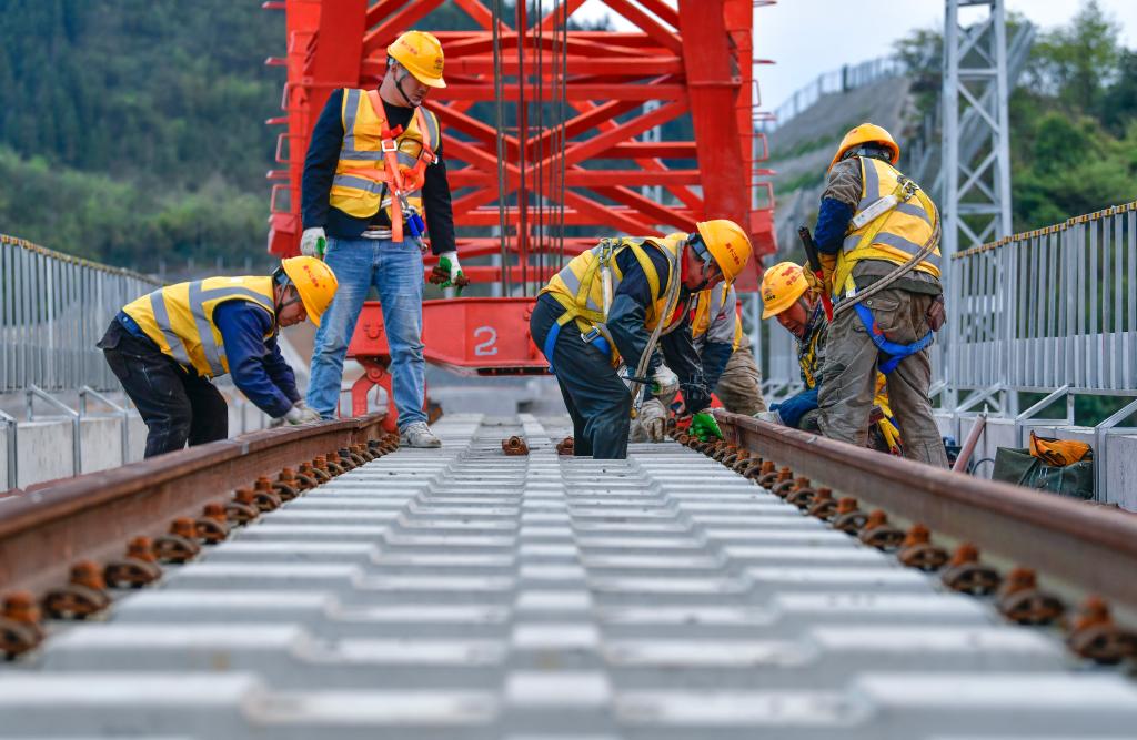 3月31日,工人在貴州甕馬鐵路南北延伸線姜家坪大橋上鋪設軌道。
