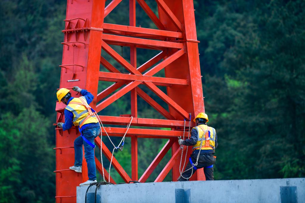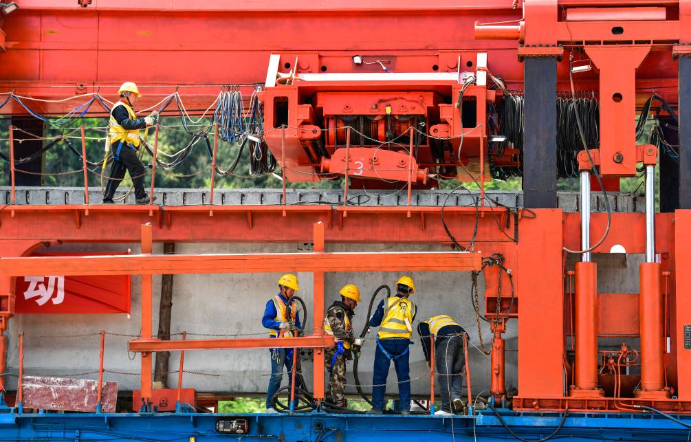 3月31日,工人在貴州甕馬鐵路南北延伸線姜家坪大橋上架設T梁。