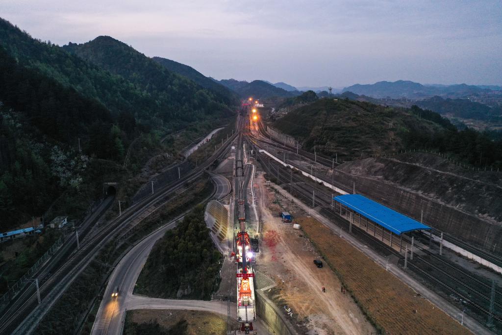這是3月31日拍攝的貴州甕馬鐵路南北延伸線姜家坪大橋軌道鋪設現場(無人機照片)。