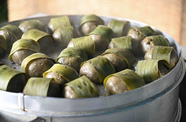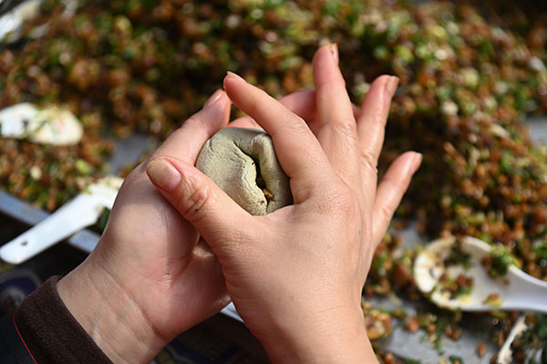 清明粑的餡料用豬肉、豆腐、蒜、鹽菜等食材炒制而成。大家把一個個面皮揉捏好後加入餡料,再揉成一個個糕團,放入鍋中蒸煮15分鐘,一個個軟糯可口的清明粑便製作好了。