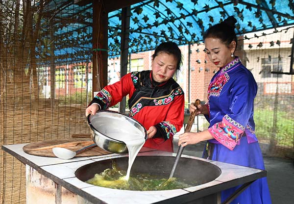 3月31日,松桃苗族自治縣的人們在把芡水倒入鍋中,準備製作清明粑面皮。謝慧芳 攝