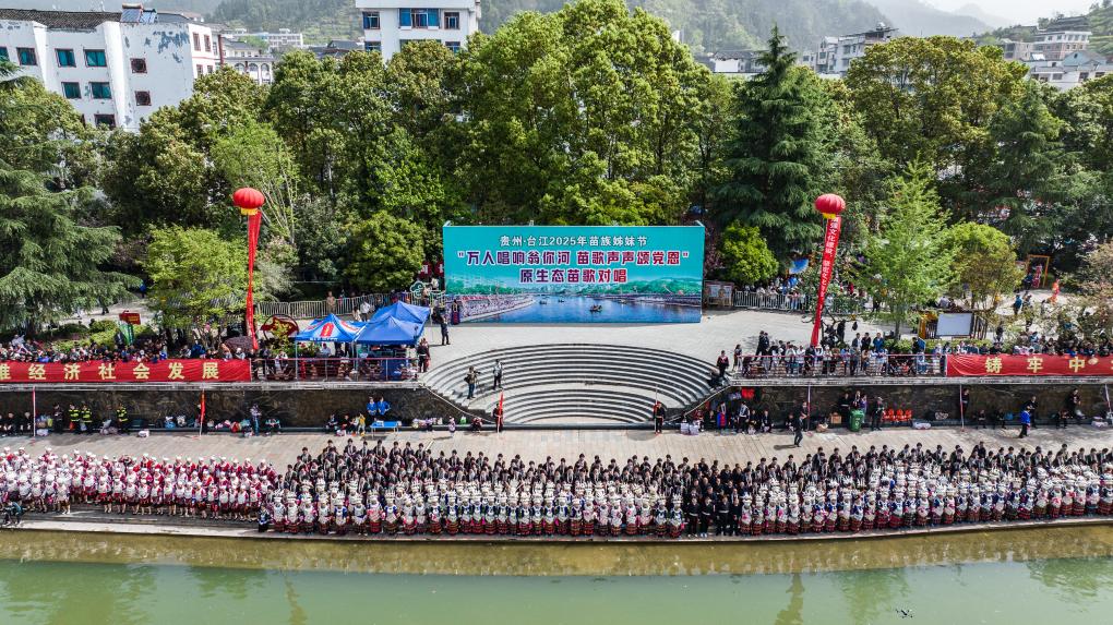 4月13日,貴州&江2025年苗族姊妹節苗歌對唱活動在&江縣翁你河畔舉行。來自&江縣的萬餘名苗族群眾,身着節日盛裝齊聚翁你河畔,以傳統對唱的方式,向游客展現苗族飛歌、情歌,歡慶姊妹節。