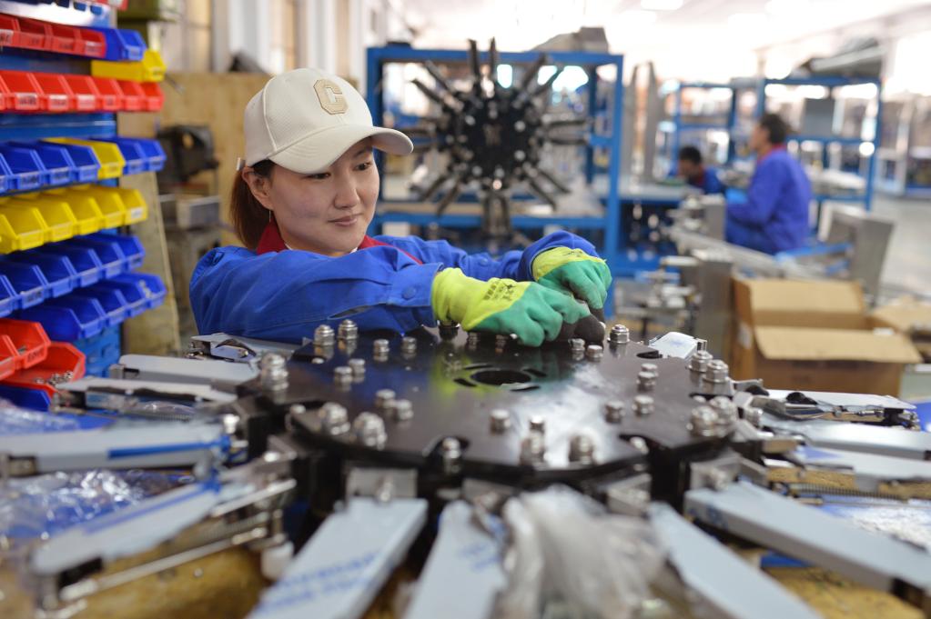 3月30日,在山東省青島市城陽區夏莊街道青島義龍裝備製造股份有限公司生産車間內,工人在組裝包裝機。新華社發(王海濱 攝)