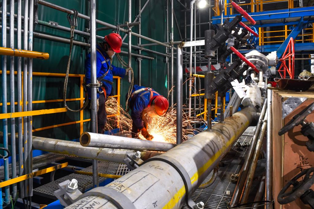 2月12日,工人在位於吉林省吉林市的中國石油吉林石化公司煉油化工轉型升級項目120萬噸/年乙烯裝置建設現場施工作業。新華社記者 許暢 攝