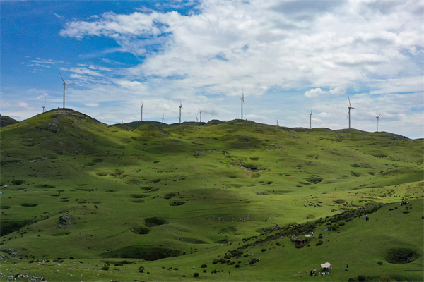 “五一”假期,在威寧百草坪景區,游客站在藍天白雲下和“大風車”合影。趙慶能 攝