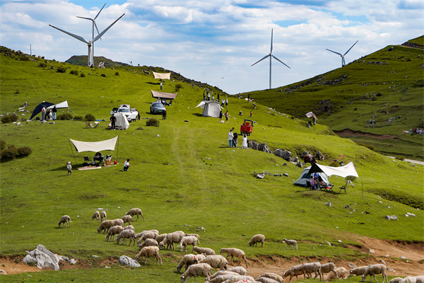 “五一”假期,在威寧百草坪景區,羊群在露營基地前悠閒地吃草。趙慶能 攝