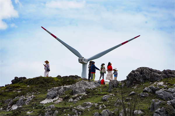 “五一”假期,在威寧百草坪景區,游客在“大風車”前拍照打卡。趙慶能 攝