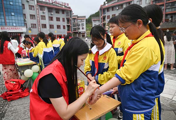 5月30日,松桃苗族自治縣的志願者在幫學生寫祝福的話語。