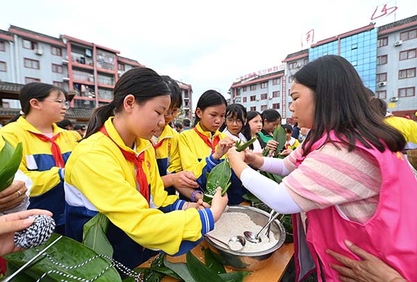 5月30日,松桃苗族自治縣婦女聯合會的工作人員在教學生包粽子。