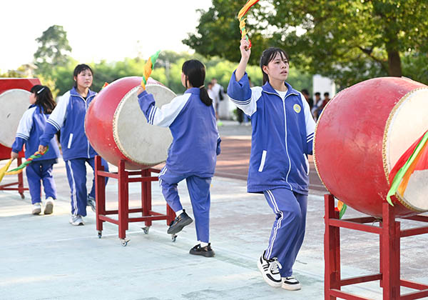 6月12日,松桃苗族自治縣正大鎮中學的學生在打花鼓。