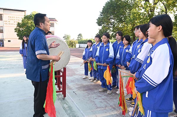 該校學生龍雙嬌學了6年打花鼓,現在她已經可以熟練地完成一整套打花鼓的動作。她還是一位花鼓“小老師”,&&指導其他同學的打花鼓動作。