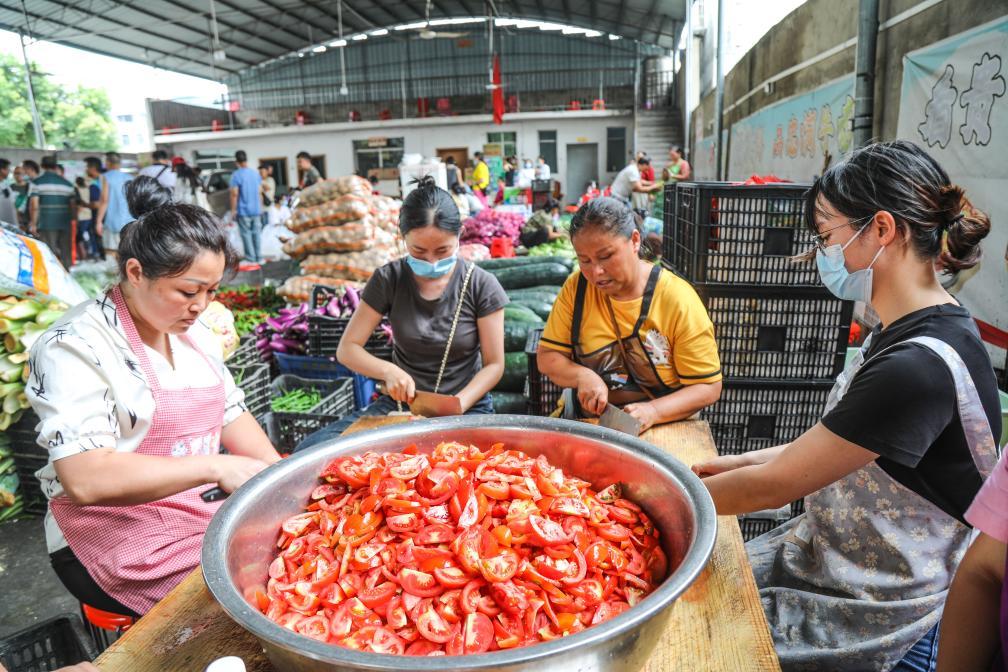 6月27日,村民在貴州省榕江縣忠誠鎮一處後勤伙食保障點切菜。新華社發(余天英攝)
