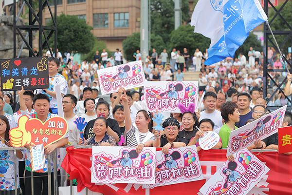 比賽尚未開始,現場已是人山人海。距離開場還有20分鐘,德江南城西麓閣廣場便被熱情的觀眾圍得水泄不通。階&、石環及廣場兩側的人行道上,擠滿了翹首以盼的人群;各選手的拉拉隊高舉燈牌、搖旗吶喊,為支持的選手加油助威。“我看好賀卿這名選手,冠軍非她莫屬!”不少觀眾對賀卿寄予厚望,現場氣氛熱烈非凡。